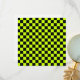 A vibrant checkerboard pattern with alternating neon yellow and black squares creates a striking geometric design, conveying a bold and energetic tone.