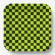 A vibrant chequerboard pattern with alternating neon yellow and black squares creates a striking geometric design, conveying a bold and energetic tone.