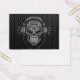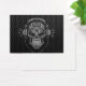 Un design élaboré de crâne à sucre DJ décoré de tourbillons complexes et de motifs à points. Les écouteurs sont assis sur le dessus du crâne avec deux fils suspendus en dessous. Les lignes et les cercles complexes sont en noir massif tandis que l'intérieur du crâne est fini avec des textures en acier inoxydable et des couleurs argentées. Le crâne est posé sur un arrière - plan en maille d'acier qui complète ce motif industriel. Cette image agressive de Day of the Dead est une représentation colorée de la culture DJ.