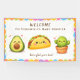 Adorable “Taco ’Bout a Baby” fiesta baby shower design featuring two cute kawaii taco, avocado and cacuts with colourful serape accents. Perfect for a fun fiesta theme baby shower.