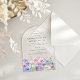 Elegant watercolor asters create a floral border at the bottom of this arch-shaped acrylic birthday invitation. The soft pastel purple, pink blue and white flowers are the September birthday month flower making this the perfect theme for your September birthday.