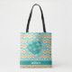 All over patterned tote bag with a background of blue, orange, peach, and white chevron stripes and a big blue sea turtle with an area you can easily add a name before ordering.