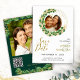 Create unique white, emerald green and gold save the date cards by uploading your photos, and typing your text and website. You can also add your QR code - to create a QR code, make sure to add your website there. Upload your photo using the template to have your round shape image on the front. The square photo is the best, but you can also try others to see if they suit here. These cards are decorated with a eucalyptus wreath and golden hearts and frame on the front side, and foliage on the back.