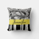 This pillow will add a unique touch to your home decor! Personalize with a first name, last name, nickname or any word you choose! Design features black and white stripes, a metallic liquid pattern and a yellow stripe around the middle that displays your custom text! This decorative pillow will look great in a girls or baby bedroom, on a couch, or outdoor furniture!