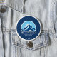 Button with a logo with a gorgeous blue mountain with a sunny background and the option to add a mountain or ski resort name.