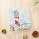 A water colour print of a lighthouse and a sailboat on the water.