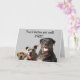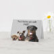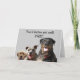 L'avant de cette carte d'obtention de bien dit, "Vous feriez mieux de vous en sortir vite !" À l'intérieur, on dit : "Ou j'envoie ces animaux pour vous lécher et vous faire du lard jusqu'à ce que vous vous mettiez bien et sortiez du lit." Cette adorable carte présente Spirit the Rottweiler, Sarge the Pitbull, Kelly the Golden Retriever chippy, et Meece the blue eyed cat tous assis côte à côte vous regardant avec des regards adorables sur leur visage. Une carte de bien-être parfaite pour les amoureux des animaux.