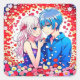 Anime boy and girl cuddling surrounded by colourful flowers. Cute anime couple, girl with pink hair and boy with blue hair. Cute for Valentine's Day, an annviersary or any romantic occasion.