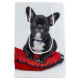 Adorable black and white bulldog puppy sat on a regal red cushion.