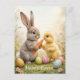A heartwarming Easter card featuring a sweet bunny and a fluffy chick sitting together, symbolizing friendship and new beginnings.