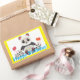 Adorable cartoon panda bear and three cubs holding balloons. Yellow border and blue text that reads Happy Birthday!