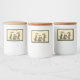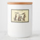 This custom label for a food jar has a pale yellow background with a brown border with two cats and two kittens all brown and white holding umbrellas walking in the falling snow. Customize your text with the template.