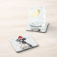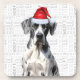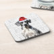 A square coaster with a white background and a grey border features a cartoon image of a Great Dane wearing a red Santa hat. The background is covered with the word "woof" repeated in various sizes and font styles.
