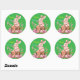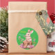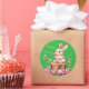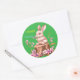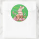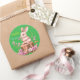 This circular holiday design features a sweet, light-pinkish bunny sitting atop a rustic tree stump. The bunny is delicately holding a small sprig of purple flowers, while the base of the stump is surrounded by vibrant pink and lavender blossoms and green leaves. The greeting "Happy Easter" is written in a playful, multicolored cursive font—yellow for "Happy" and light blue for "Easter"—set against a solid, bright green background.