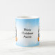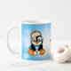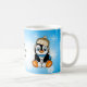 A cute funny hand drawn cartoon penguin with snowballs and snowflakes background. Personalized coffee mug.
