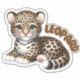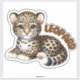 This large nursery sticker features an irresistibly cute, cartoon-style baby leopard with a gentle and endearing expression. The leopard is depicted lying down, with its small paws tucked under its body and its tail curled around. It has a classic spotted fur pattern, large expressive green eyes, and a soft pink nose, adding to its charm. The word "LEOPARD" is written in bold, playful letters to the right of the leopard, complementing the overall child-friendly design.