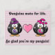 Two adorable penguins with pink heart and light pink stripes. I drew a purple hat with flower for the one on the left, and a hot pink hat with ribbon for the one on the right. Replace the sample text with your own words for a unique gift. Makes a wonderful gift for a lesbian couple, gender neutral or gay wedding ceremony, proposal, engagement, anniversary, as well as baby birth or adoption.