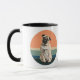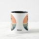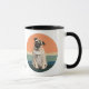 A portrait of an adorable Pug Dog is the feature on this mug. The image is placed on a retro, slightly distressed coral and blue sunset background, and printed twice on the mug. Your name is in black script between the images.