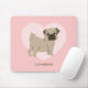 Sweet illustration of a cute pug on a pink background and a large pink heart.