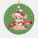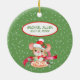 "My First Christmas" declares the banner beneath an adorable mouse image on this Holiday ornament. The mouse wears a red and white Santa hat and a red bow tie. Holly sprigs decorate the banner and the hat, and a red ribbon lies curled behind the image. Pale green snowflake confetti fills the background. The back of the ornament has a smaller version of the front image, with a banner holding two text fields for you to customize. A wonderful keepsake for Baby's First Christmas!