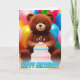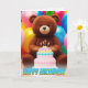 This adorable birthday card features a cute, cuddly teddy bear surrounded by a vibrant and colorful display of birthday cakes and balloons. It's the perfect card to spread joy and love on someone's special day!