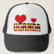 Adorable Uganda Flag Hearts Patriotic Trucker Hat with the inscription "Uganda" displayed on the front of the hat. Inscription is infused with the pattern and the colours from the Uganda national flag. Two red hearts, one big and one small finish the design. Hearts are fully customizable or removable using "Customize it!" feature. Base hat colour complements the design very well. This delightful hat is a lovely and unique gift. © CountriesOfTheWorld