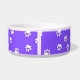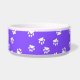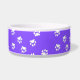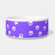 This large-sized dog bowl has a violet background with white paw prints on it. Great size for larger dog varieties. It holds 40 oz of food and is white ceramic material. It is safe for the microwave and dishwasher as well.