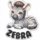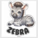This large nursery sticker features an adorably cute, cartoon-style baby zebra with a sweet and endearing expression. The zebra is depicted lying down with its small legs tucked under its body. It has a classic black and white striped pattern, large expressive blue eyes, and a small tuft of mane on its head, adding to its charming appearance. Below the zebra, the word "ZEBRA" is written in bold, playful letters, perfectly matching the cute and child-friendly design.