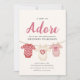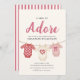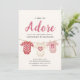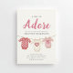 Celebrate the upcoming arrival of a precious baby girl with this "Adore A Girl" baby shower invitation. The design features three darling clothing hanging on a clothesline, each with adorable patterns and colors perfect for a little lady. The soft pink and cream color palette exudes sweetness and charm, making it an ideal choice for a traditional or modern baby shower. This invitation is a beautiful way to invite your loved ones to share in the joy and excitement of your new chapter.