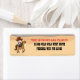 Envoyez les invitations d'anniversaire de votre enfant avec style avec cette étiquette d'adresse de retour avec un cowboy faisant le tour d'un cheval à travers un arrière - plan du désert. Parfait pour les invitations à thème occidental de vos invités. Facile à personnaliser avec des options personnalisées.