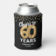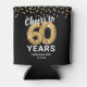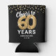 Personalized 60th birthday can coolers featuring a stylish black background that can be changed to any colour, glamourous gold sparkly glitter, sixty gold hellium balloons, and a simple text template that is easy to personalize.