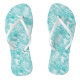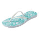 Adult flip flops are shown in a cute aqua colour tropical flowers print with thin white straps.