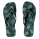 Adult flip flops are shown in black with a lovely tropical palm print.