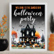 Welcome your guests in style with this spooky yet simple party sign! Featuring the text "Welcome to the [Your Name] Halloween Party" on both the front and back, the design uses a handwritten script calligraphy paired with a grunge sans serif font for a hauntingly stylish look. The black and white colour scheme highlights a haunted house at the centre, accented with pops of orange from pumpkins, jack-o'-lanterns, and eerie trees. Playful ghosts and bats add a whimsical touch, making this sign perfect for setting the tone of your Halloween celebration with a vintage charm. Ideal for greeting guests at the door and creating a fun, festive atmosphere!