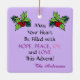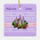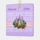 Front: An illustration of an Advent wreath made of evergreens and holly with all four candles lit against a background of horizontal stripes. The horizontal stripes are bordered in white and, reading from top to bottom, contain the words hope, peace, joy, and love in white capital letters. The words epitomize the themes of Advent’s four weeks. The background is largely violet (light purple or lilac) except for the stripe behind the word joy which is pink in keeping with the liturgical colour of the Third Sunday of Advent known as Gaudete Sunday. + Back: A seasonal wish incorporating the themes of the four weeks of Advent: hope, peace, joy, and love. + Image Credits: Black and white Advent wreath AI-generated by mimicoloringdesigns via Pixabay, modified and colorized by Saints_Aplenty; bow by Elionas also via Pixabay.