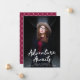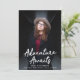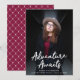 Trendy graduation announcements featuring the graduate's vertical photo with "Adventure Awaits" in white handwritten script lettering. Personalize the front of the Adventure Awaits graduation announcements by adding the graduate's name, school name, and graduation year. The announcement reverses to display an elegant burgundy and white trellis pattern.
