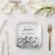 This baby shower paper plate offers an rustic mountain adventure theme showcasing a watercolor wilderness landscape of mountains, ponds and pine trees. This is perfect for an outdoor event.