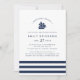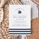 Set sail for the biggest adventure of your life! Our sweet nautical baby shower invitation features a navy blue ship illustration with "adventure awaits" in modern lettering, topping your event details. A striped band in navy and white along the bottom completes the design. Cards reverse to a nautical anchor pattern in white on navy.