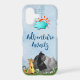 A phone case which says adventure awaits. Set on a light blue watercolor background. A blue cloud and an orange sun sit in the sky. A meerkat, gorilla and hippo all together on some savannah grasses, about to embark on some adventure.