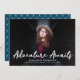 Trendy graduation announcements featuring the graduate's horizontal photo with "Adventure Awaits" in white handwritten script lettering. Personalize the front of the Adventure Awaits graduation announcements by adding the graduate's name, school name, and graduation year. The announcement reverses to display an elegant dark blue and white trellis pattern.
