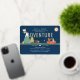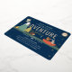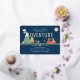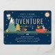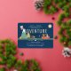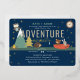 A new adventure awaits is a modern design including woodland animals and camping elements in chic colours like navy and green, with touches of gold foil stamped.