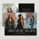 Modern and elegant graduation announcement photo card featuring 3 photos on the front and 1 on the back. The text says "the adventure begins." Add the graduate's name, information, and message to personalize this card. Black color.