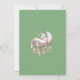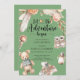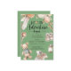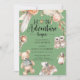 A cute baby shower invitation featuring a boho style mix of baby items from teddy bear to bodysuit, baby bottle and baby shoes with florals and feathers, on a green background.