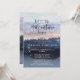 A forest theme adventure begins blue baby shower invitation with a pretty forest landscape, tree line and twinkling stars. Rustic and serene.