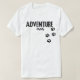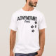 This design features the phrase "ADVENTURE DOG" in a bold, distressed font. "ADVENTURE" is written in all caps with a black, rugged style that gives a sense of the outdoors and exploration. The word "DOG" is in a vibrant black, handwritten-like font, adding a playful and energetic touch. Next to the text are several black paw prints that trail diagonally upward, reinforcing the adventurous, dog-related theme. The overall feel suggests an active, outdoor lifestyle with dogs, perfect for pet lovers who enjoy the outdoors.