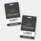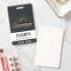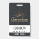 Personalized name badge with a gold coloured illustration on a black-grey background. Designed with an illustration of a mountain with the suns rays shining outward from behind. Typography says: Adventure explore dream discover.