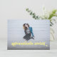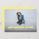 This full bleed photo graduation announcement and invitation features the words "adventures await" in light yellow. It has space for your graduate's details on the front with even more room for text on the back of the card.