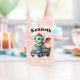 A cheerful baby dragon with blue scales and red accents gleefully steers a vintage blue truck. Its playful spirit shines as it embarks on a whimsical journey through a vibrant fantasy landscape.