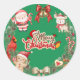 This is a cute aesthetic sticker for christmas. It is a circular sticker with little characters like gingerbread, candy and santaclaus.