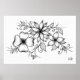 Croquis au crayon de graphite de trois jolies fleurs, mis en évidence par de multiples feuilles et des vignes grasses. © Alina Davis 2014